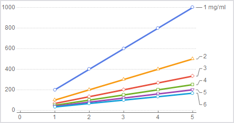 Speed of increase of the mixture's volume according to your nicotine level. Lower this latter is, faster the volume of mixture increases with the number of bottles (horizontally, from 1 to 5). If 5 bottles are required to obtain 1 liter of mixture at 1 mg/ml, 30 will be required to obtain the same volume at 6 mg/ml.