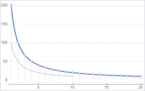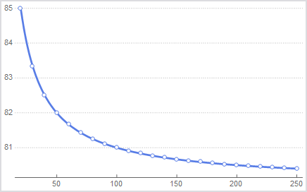 The quotient your nicotine level / bottle's nicotine strength decides the PG/VG of the mixture. The smallest it is (i.e. the highest the bottle's nicotine strength is), the closest the PG/VG of the mixture is to the one of the neutral base. This is illustrated by the curve below. The nicotine level is 5 mg/ml and no flavour is added. The neutral base contains 80% of PG and the bottle 100%. Higher the nicotine strength of the latter is (from 20 to 250 mg/ml, horizontal axis) more the percentage of PG of the mixture (vertical axis) approaches 80. The explanation comes from the fact that higher the nicotine strength of the bottle is, less its volume is used to reach your nicotine level. This results in a decrease in the influence of the percentage of PG from the nicotine base on the final PG/VG. Therefore, the 10 ml bottles at 20 mg/ml cause the largest difference. You can check this fact in the "Larger" and "Parameters" tabs, by changing the bottle's nicotine strength.